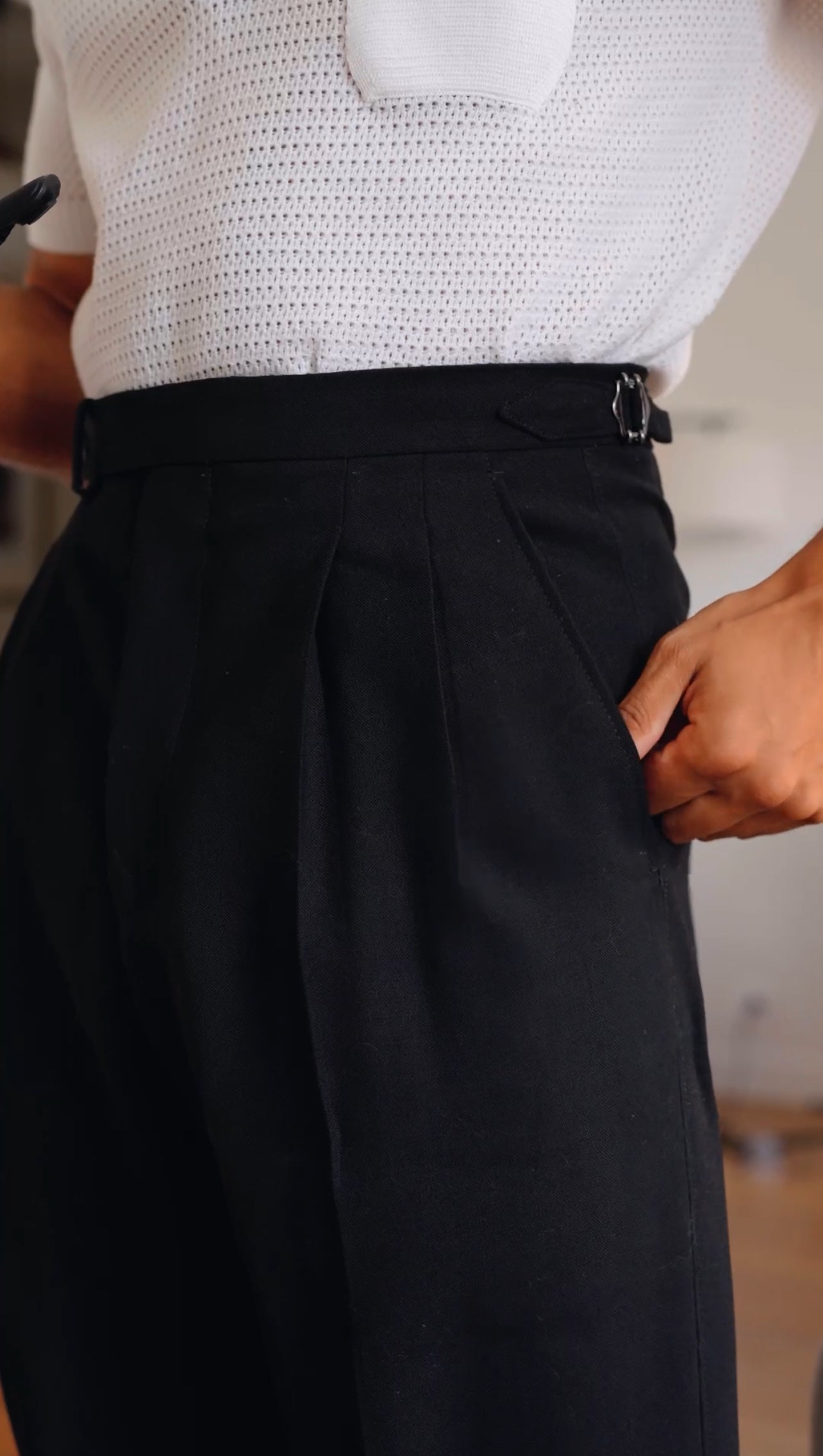 Pantalon noir en fresco, avec double pinces à l'italienne (vers l'extérieur).
